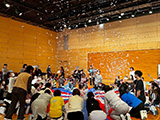 フリームーブメントでは子どもたちが遊ぶ姿に誘われた受講者の皆さまが、それぞれのエリアに置かれたハットフリスビー、形板、変化球のプールスティックや風船に触れながら、いつの間にか遊びを展開し、開会式前から会場はすでに熱気があふれました。