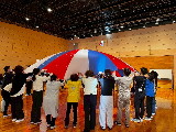 3つのテーマで実技を行いましたが、「交流学習」のパラシュートを使って遊びでは、パラシュートの上を歩いたり、メリーゴーランドをしたり、自分では体験できない動きに、みんな笑顔でにぎやかな声が響きました。最後はみんなで心を一つにパラシュート飛ばし!天井にペタッときれいに張り付いて、大きな拍手が起こりました。本部から来ていただいた、阿部先生からは「みんなで輪になって顔を見合うことで、わたしもこの中の一人なんだと実感できる。ちょっとしたことかもしれないけれど、みんなと一緒にしたらこんなに楽しいんだ、できるんだという気持ちになれることが、ムーブメントの力」というお話を聞き、ムーブメントの魅力を再発見した時間となりました。大阪での夏の1日が皆さんにとってこれからのムーブメント実践へのパワーにつながりますように☆(大阪会場 金川)
