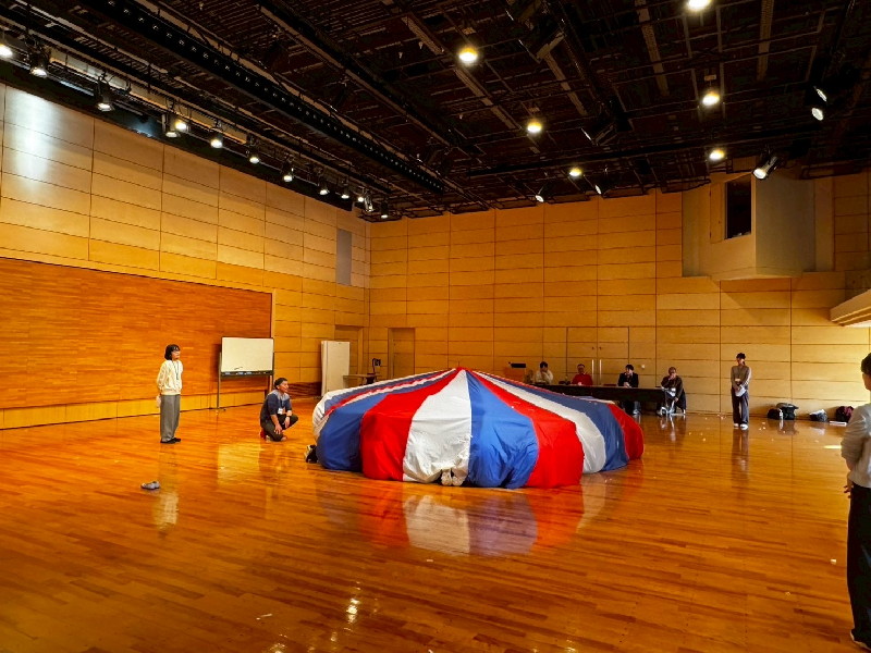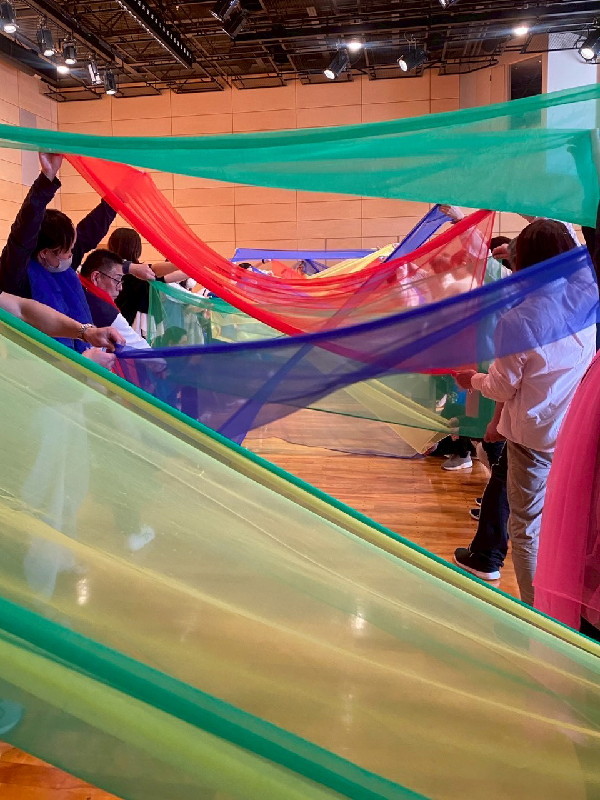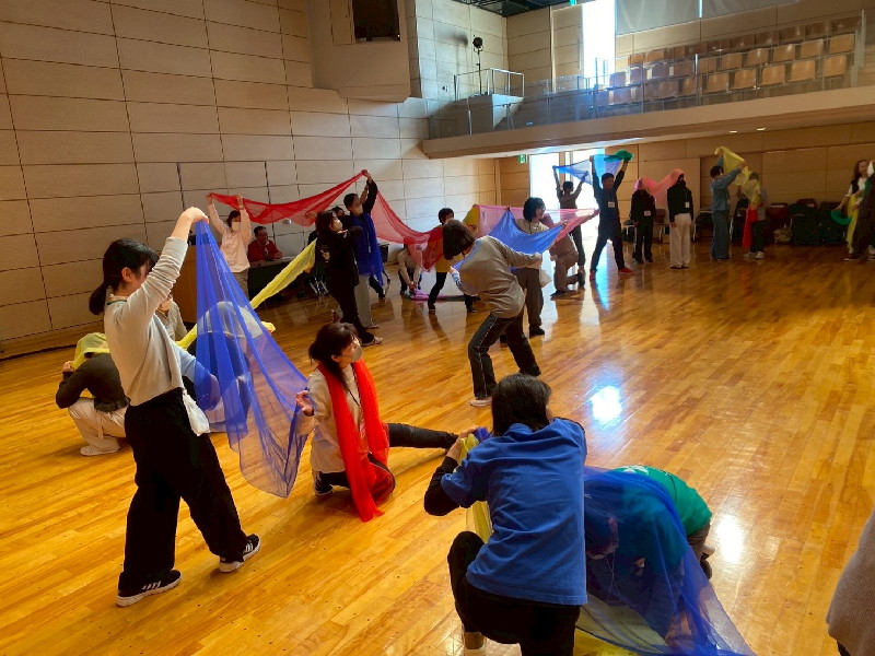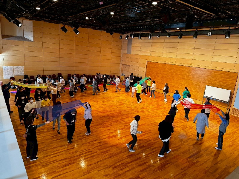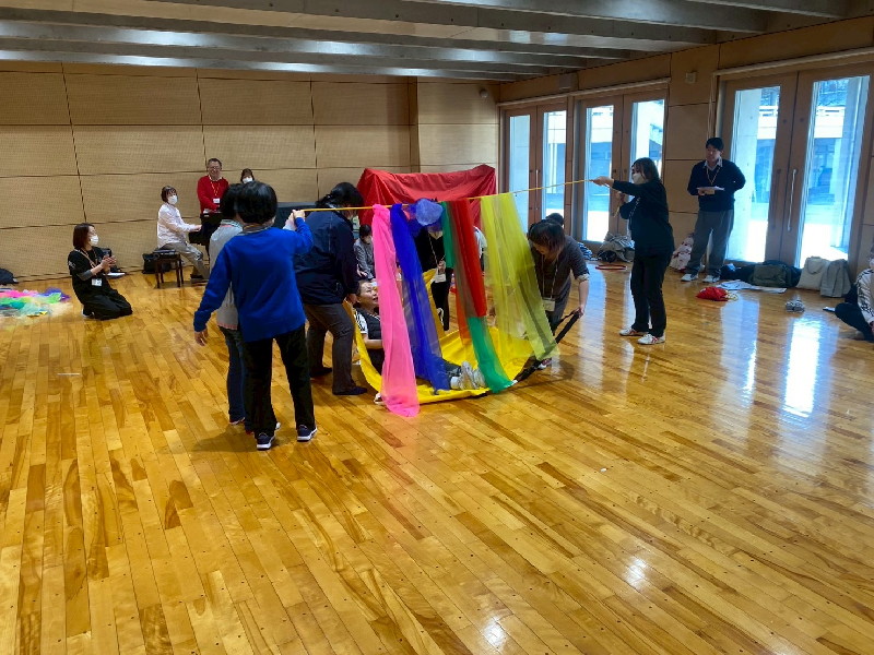最後の「幸せな遊びの場を共につくる、共に育つこと~時間・空間意識、心理的諸機能を育てるムーブメントプログラムを中心に~」では、パラシュートの活用を事例に「共に…」を実現する遊具の活用を共有しました。また、最後は、受講者全員で春夏秋冬をイメージしながらクリエイティブムーブメントに挑戦しました。